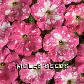 A unique series of seed raised Petunias that have been bred over many years and are genetically different to cutting raised varieties of a similar apperance and without the financial drawbacks. Dot Star are well branched with flowers in vibrant colours overlaid with white dots and spots giving a fun splattered effect. High level of weather resistance. Height approximately 30 cm.