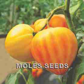 A heritage style variety that produces oxheart fruits of up to 250 grams in weight. Eye-catching orange fruits with red streaks. Juicy flesh and good flavour. Fruit: orange, oxheart, 200-250 grams. Resistant to Fol (0,1,2), Va (0), Vd (0), ToMV (0,1,2); intermediate resistance to Pi, TSWV.